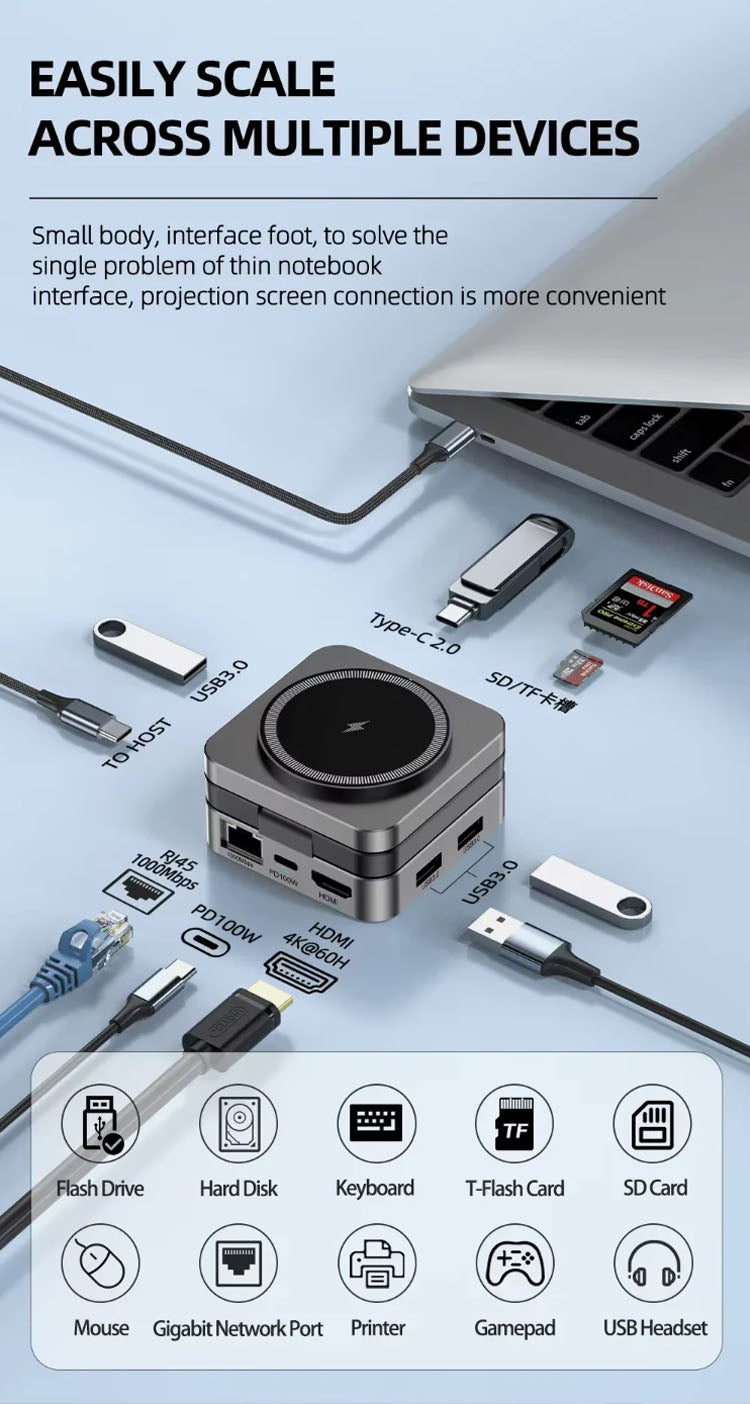 Interface: PD + HDMI 2.0 + RJ45 + SD + TF + 3×USB 3.0 + USB-C + Wireless Charger