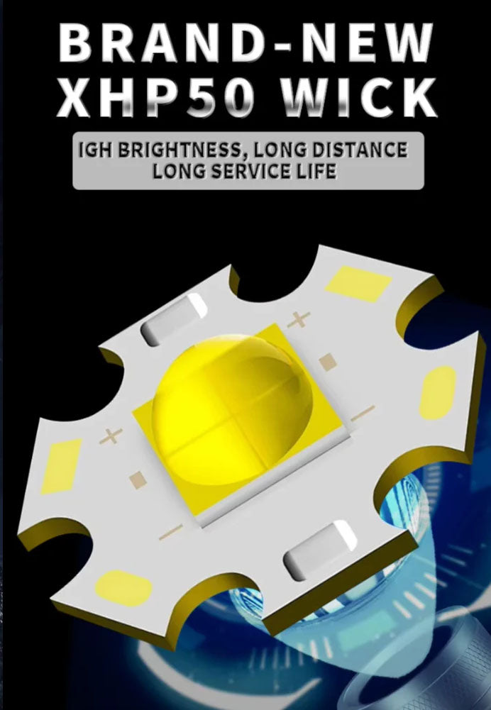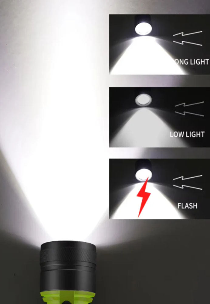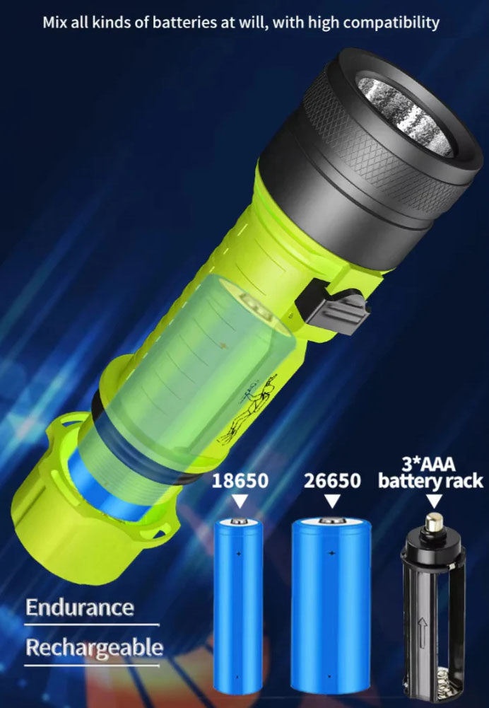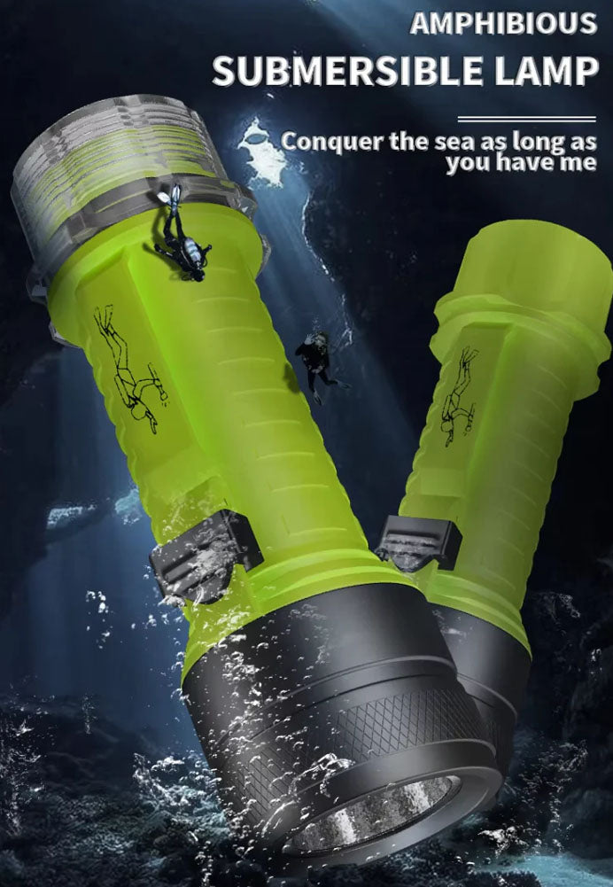 This high-performance diving flashlight is built for deep-sea use, with a powerful XH-P50 LED delivering up to 1800 lumens of brightness. Designed for both recreational and professional divers, it offers reliable lighting at depths of up to 100 meters.