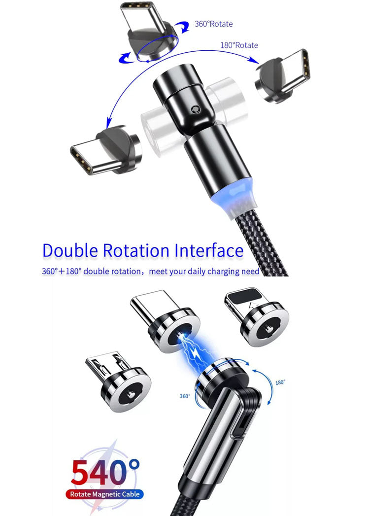 Power up your devices with ease using this versatile, nylon-braided magnetic cable. With 540° rotation, 3A fast charging, and 3 interchangeable heads (Type-C, Micro USB, 8-pin), this cable is perfect for home, car, or office use.