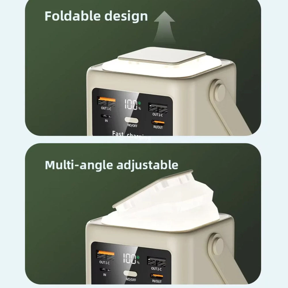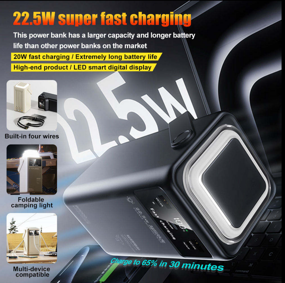 The CampPower 80K is a rugged, high-capacity power bank designed for outdoor life. With 80,000mAh real capacity, it can power multiple devices simultaneously using 22.5W fast-charging technology via USB, Type-C, and Lightning ports. Built-in 4 charging cables, a high-lumen camping light, and a digital display make it the ultimate all-in-one solution for campers, travelers, and emergency backup.