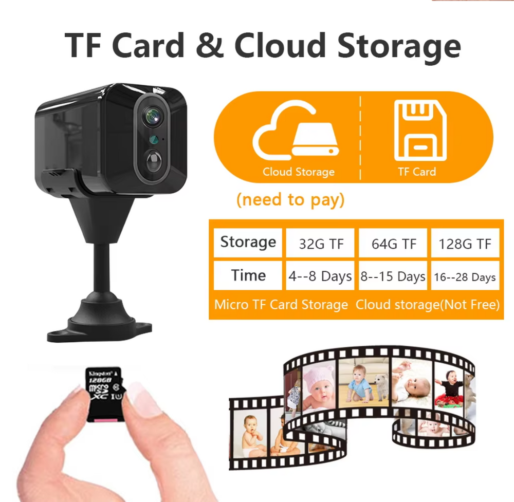 Flexible Storage: Save footage to TF card (up to 128 GB) or cloud.