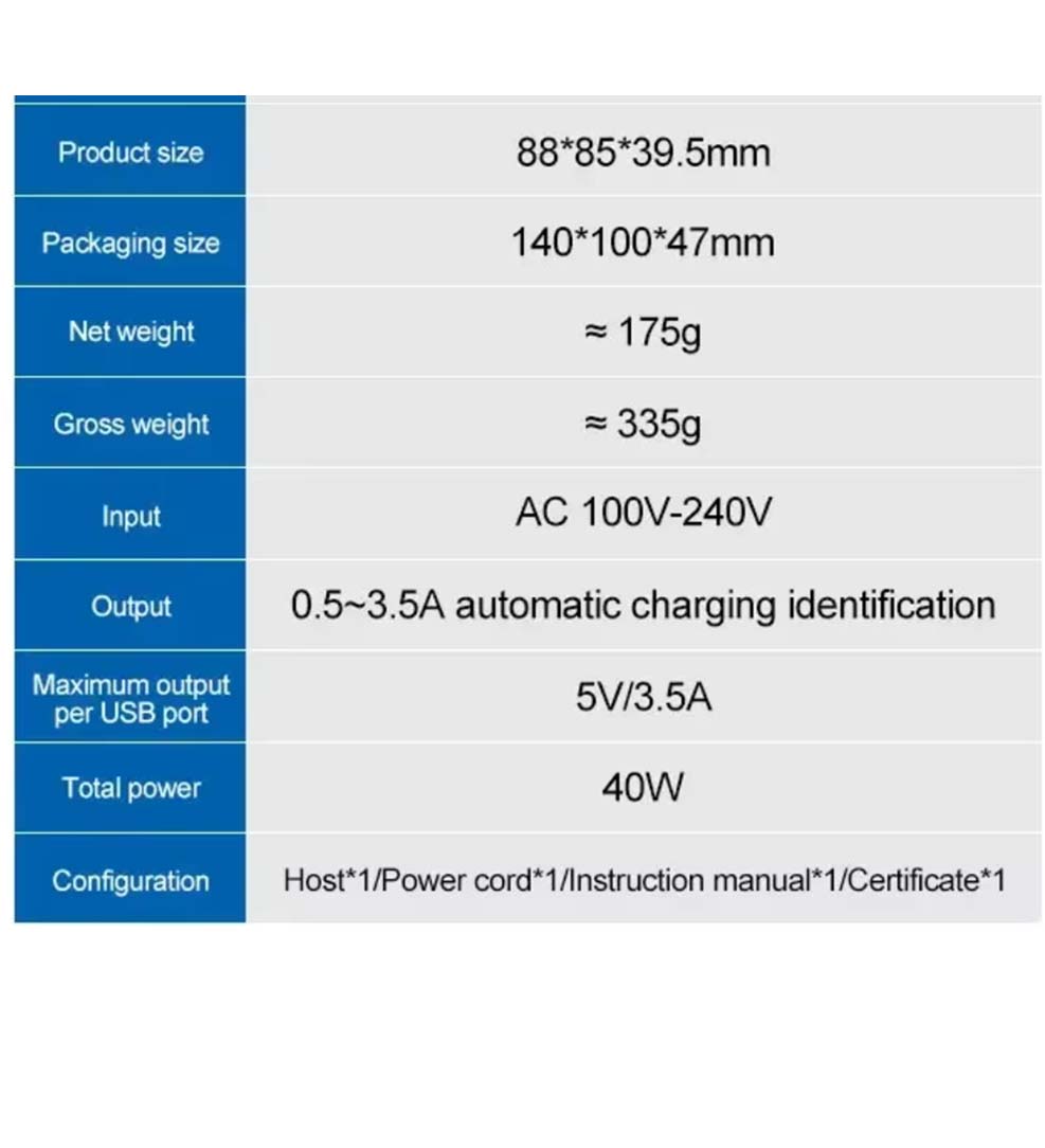 0.3A max; 5V/6A output, 6W power, 6 USB ports, LED indicator, ABS material, size 88×86×37mm; high compatibility, AC to DC conversion.