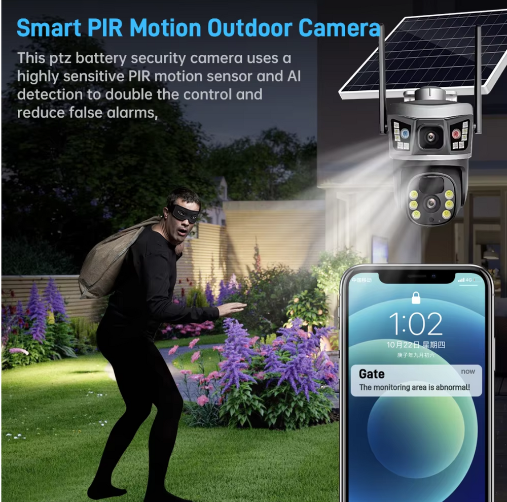 Solar-WiFi Dual Lens PTZ Security Camera – 4MP+4MP | 8W Panel + 12000mAh | Solar-Grid | Full Color Night Vision